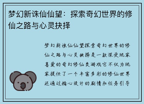 梦幻新诛仙仙望:探索奇幻世界的修仙之路与心灵抉择